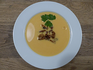 Kürbis-Kartoffel-Crème Suppe mit Vanillepfifferlingen Wildschweinbraten mit Kirschensauce Apfel auf Blätterteig mit Karamellrahm Herzoginkartoffeln