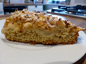 - Den Teig in die Form geben, die Apfelscheiben darauf verteilen und etwas andrücken
