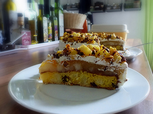 - Die gerösteten Streusel auf der Torte verteilen und noch einmal 30 Minuten kalt stellen
