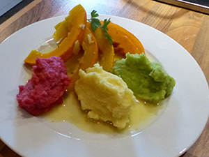 - Kürbis waschen, entkernen und in Spalten schneiden