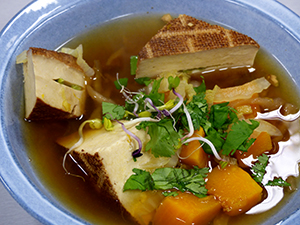 - Zwiebel und Ingwer in Olivenöl andünsten, Kürbiswürfel zufügen und kurz mitdünsten