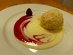 - Währenddessen Himbeerpüree und Vanillesauce auf Tellern anrichten