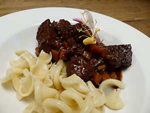 - Gulasch etwa 90 Minuten weichdünsten und gegebenenfalls Rindssuppe nachgießen
