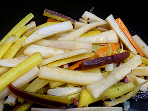 Die gelben Rüben in dünne Scheiben schneiden oder hobeln Butter erhitzen und die Rüben darin 10 Minuten dünsten Aus Zucker, Brühe, Balsamico, Olivenöl und gehackter…