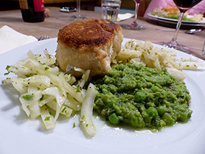 an Fenchel-Koriander-Gemüse und Minz-Erbsen Püree Kräuter abzupfen und mit den Schalotten fein hacken Mit Butter und Zitronensaft mischen sowie salzen und pfeffern Filets trocken tupfen,…