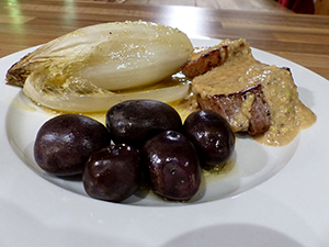 an geschwenkten Kartöffelchen und Chicorée Sultaninen einweichen Haselnüsse und Mandeln in einer trockenen Pfanne anrösten, auf einen Teller geben und abkühlen lassen Anschließend grob hacken…