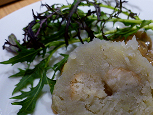 - Mit nassen Händen aus dem Teig gleichgroße Klöße formen und in die Mitte jeweils 3 - 5 Semmelwürfel drücken