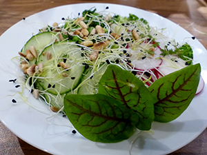 Erbsen in kochendem Wasser 3 – 4 Minuten blanchieren, abschrecken und und abgießen Salat waschen, putzen, trocken schütteln und etwas zerkleinern Radieschen in feine Scheiben…